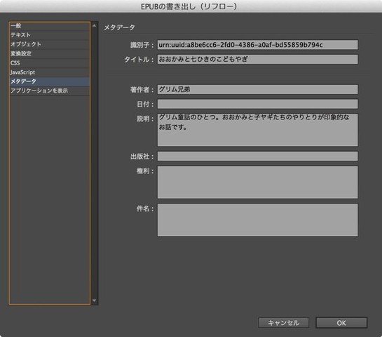 CS6では、書籍タイトルや著者名などは[ファイル]メニュー→[ファイル情報]で[ファイル情報]パネルを開いて指定し、出版社や書籍IDなどは書き出し時の[EPUB書き出しオプション]パネルで指定しました。