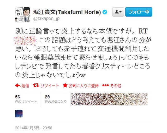 昨日「新幹線車内で泣く子供に対するツイートへのホリエモンのRTが炎上」で紹介したようにホリエモンこと堀江貴文氏のTwitterコメントが炎上したという話をお伝えした。