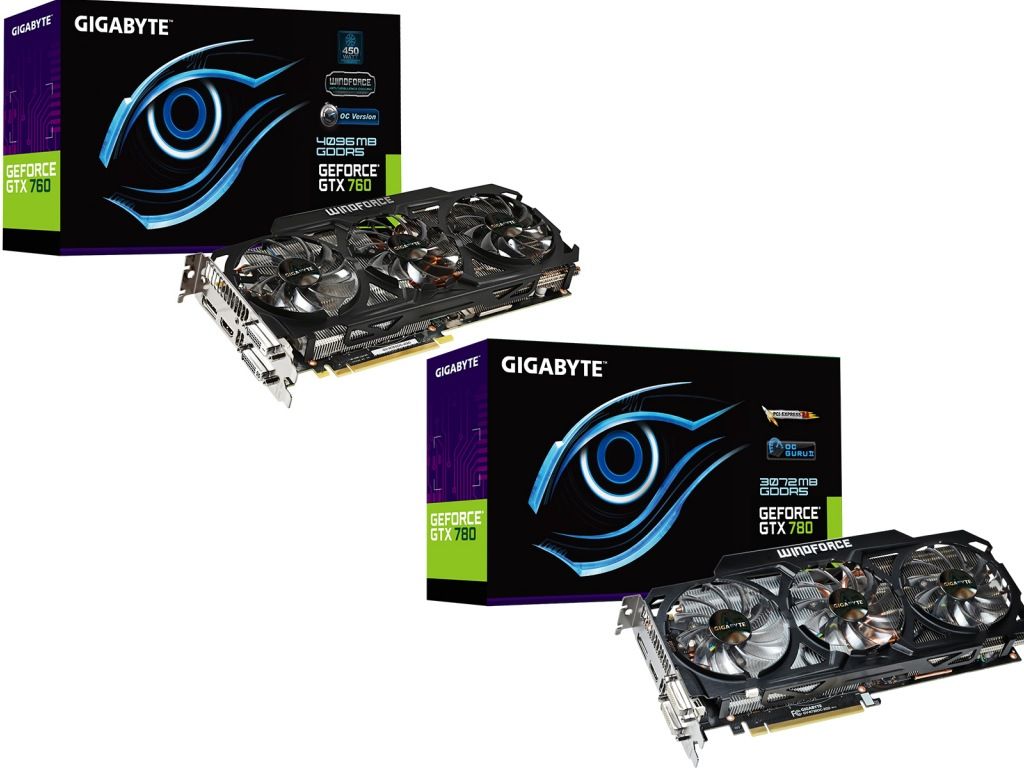 GIGABYTEよりNVIDIAのGeForce GTX760を搭載する「GV-N760OC-4GD」、GeForce GTX780を搭載したグラフィックスカード「GV-N780OC-3GD REV2」が登場した(取り扱いはCFD販売)。いずれもオーバークロック仕様となっておりGV-N760OC-4GDは、ベースクロックを980MHzから1085MHz、ブーストクロックを1033MHzから1150MHzにオーバークロック。GV-N780OC-3GD REV2はベースクロックを863MHzから954Hz、ブーストクロックを900MHzから1006MHzにオーバークロックしている。上位モデル、GeForce GTX TITANとほぼ同等の性能を発揮するとしている。